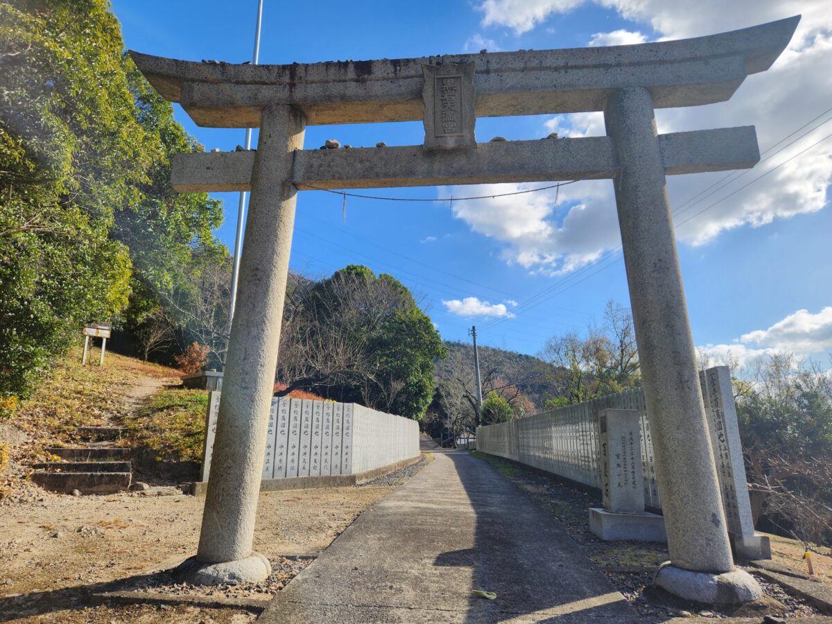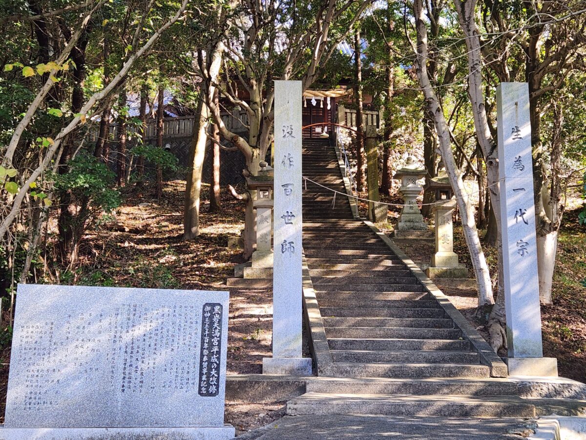 Sugawara no Michizane, revered as the god of learning, served as a provincial governor in Sanuki Kokufu (located in today’s Fuchu-cho, Sakaide) from 886 to 890. During a severe drought in Sanuki in 888, he performed prayers for rain at Myoujinbara on Mt. Kiyama, and after rain finally fell, he offered thanks. It is said that Kuroiwa Tenmangu was later established on the very site where he expressed his gratitude.